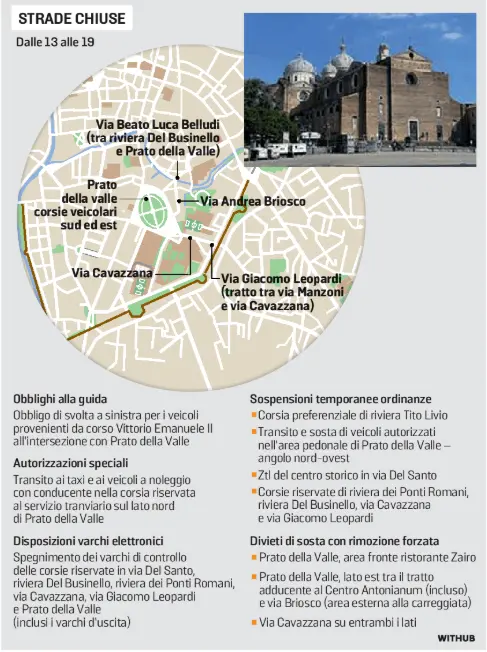 Dalle 13 alle 19 di oggi saranno chiuse al traffico Prato della Valle – corsie veicolari sud ed est; via Andrea Briosco; via Beato Luca Belludi– nel tratto compreso tra riviera Del Businello e Prato della Valle; via Cavazzana; via Giacomo Leopardi – nel tratto tra via Manzoni e via Cavazzana. Nella stessa fascia oraria sarà istituito l'obbligo di svolta a sinistra per i veicoli provenienti da corso Vittorio Emanuele II all'intersezione con Prato della Valle.
