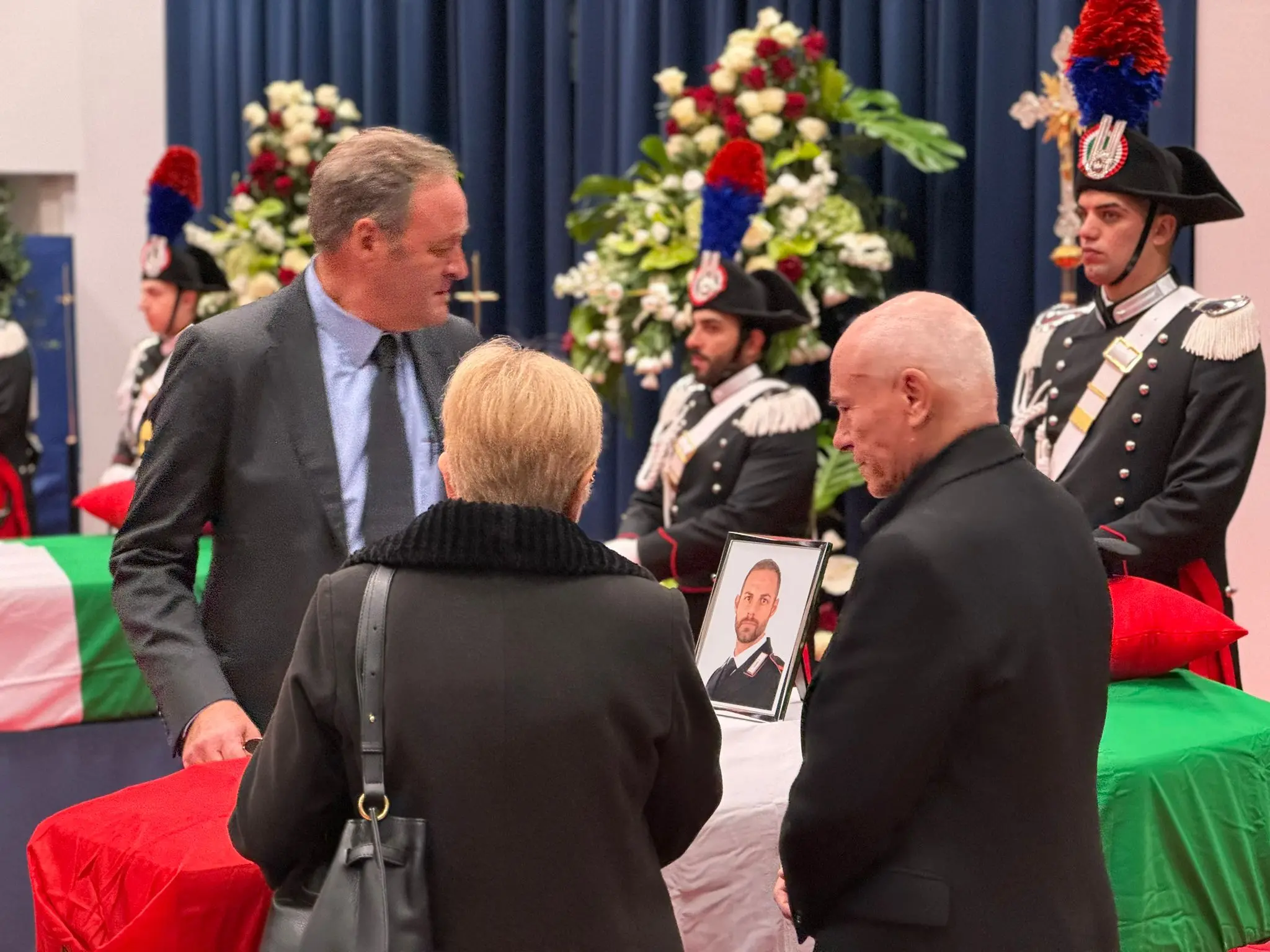 Crosetto commosso: "L’Italia è qua e si raccoglie in un profondo dolore. Tre carabinieri, tre soldati, tre servitori dello Stato. tutti i carabinieri d’Italia sono qua con la mente, in nome loro voglio abbracciarvi e dirvi grazie. Non ci sono parole per consolarvi, nulla che possa riempire il vuoto che lasciano Marco Valerio Davide, non esiste nulla.