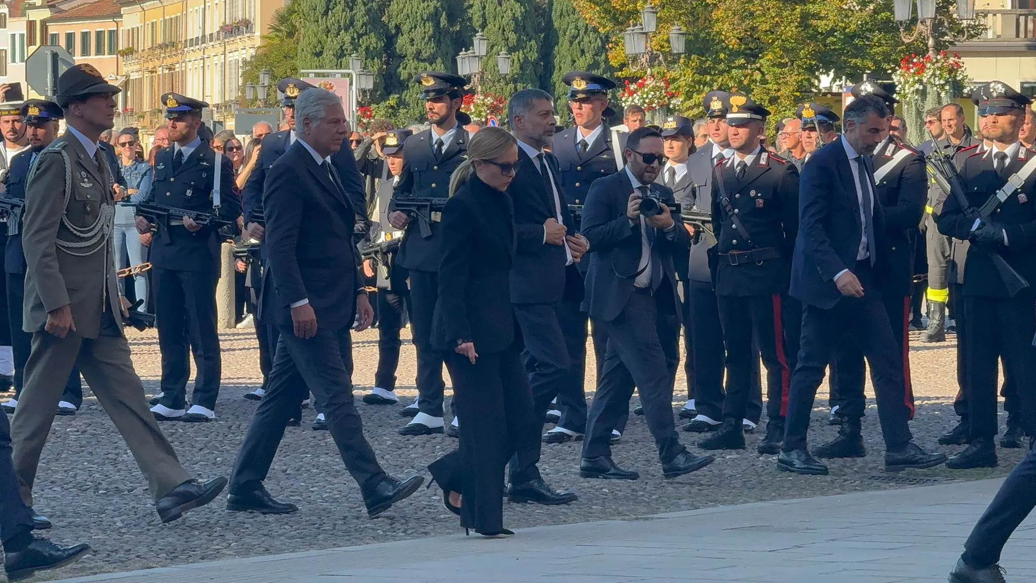 L'arrivo di Giorgia Meloni e dei ministri ai funerali di Stato a PadovaIn Prato della Valle il ministro Crosetto
