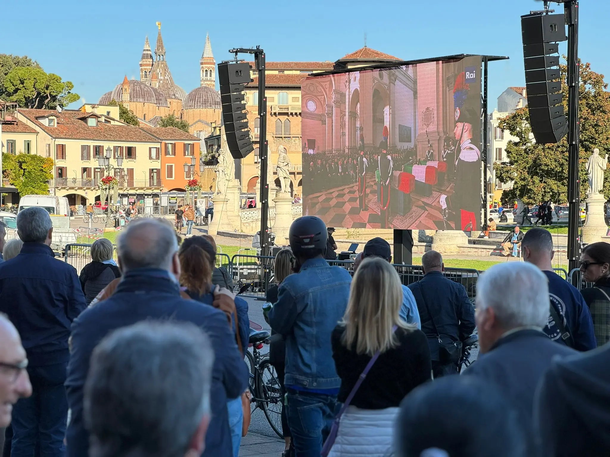 Trecento persone si sono riunite sotto al maxi schermo allestito di fronte alla loggia Amulea, dal lato opposto di Prato della Valle rispetto alla basilica di Santa Giustina dove in questo momento si stanno svolgendo i funerali. Da qui stanno seguendo in diretta la funzione