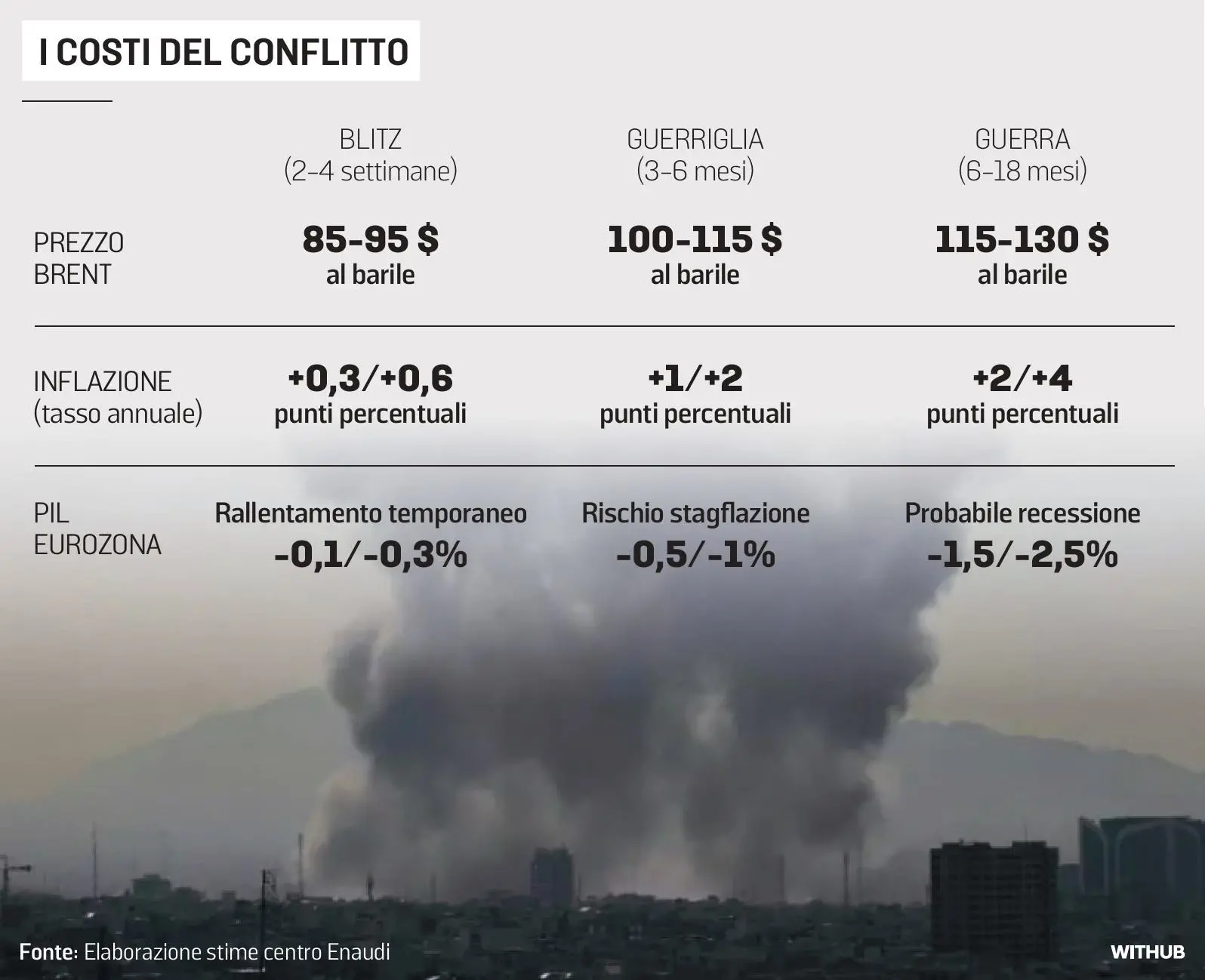 Se andassimo per le lunghe si metterebbe peggio. L’ipotesi che gli uomini di Khamenei resistano sino all’autunno fa immaginare il petrolio oltre i 100 dollari, uno o due punti di inflazione in più per l’Area Euro (con probabile conseguente aumento dei tassi) e un orizzonte di stagnazione per le economie più solide. L’effetto sarebbe generalizzato.