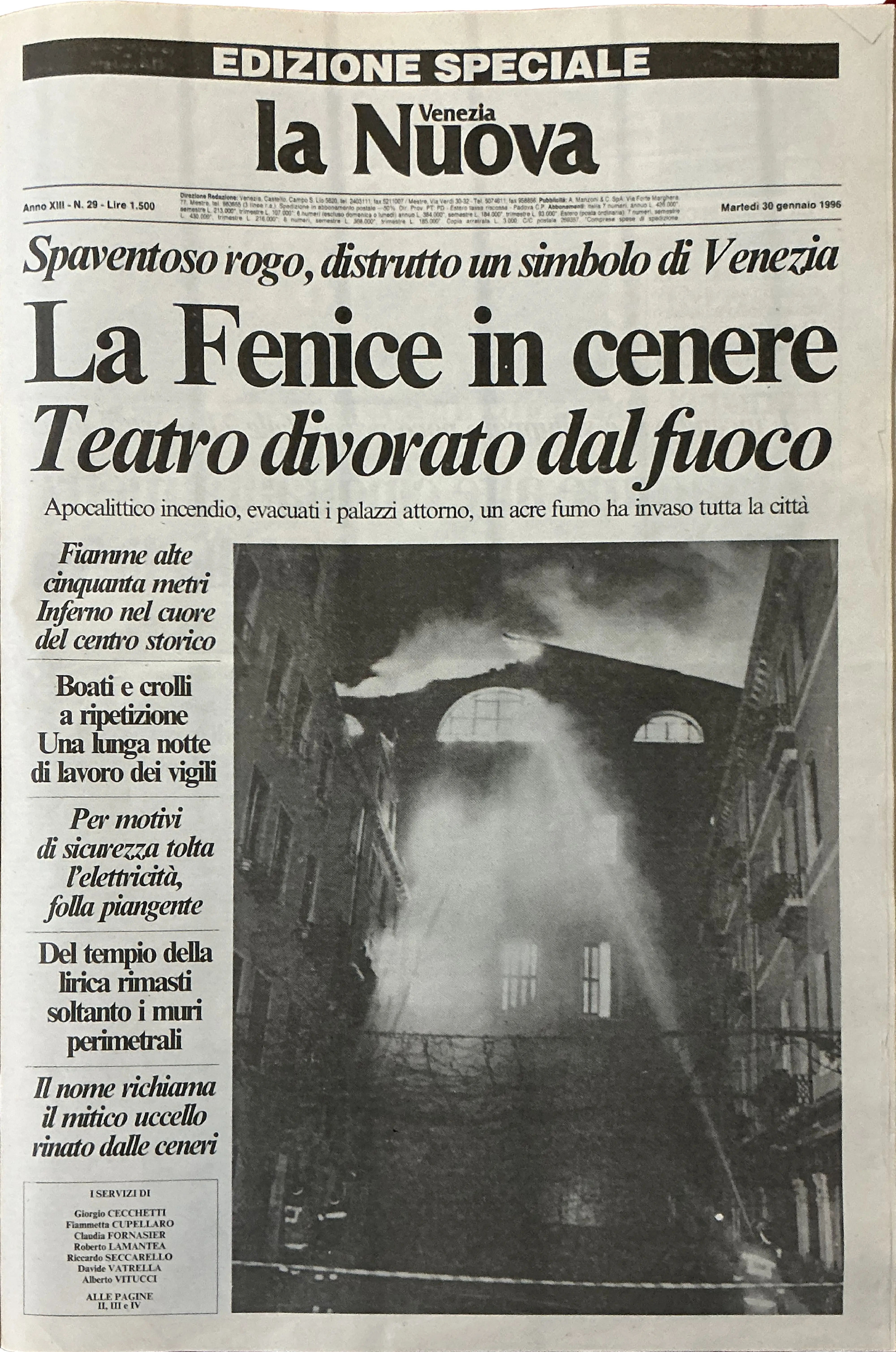 Le lingue di fuoco che la notte del 29 gennaio 1996 squarciarono la notte della laguna, carbonizzando i resti della Fenice, non sono state vane. Da quelle ceneri, spinte dai venti fin sopra la Giudecca a testimonianza dell’enormità del rischio che corse l’intera città, nacque infatti anche un’opportunità. Quella di mettere al sicuro Venezia dal fuoco, con la prima rete antincendio cittadina (parallela e separata dalla rete idrica), fino a quel momento inesistente. Oggi, 30 anni dopo, l’opera non è ancora completa.