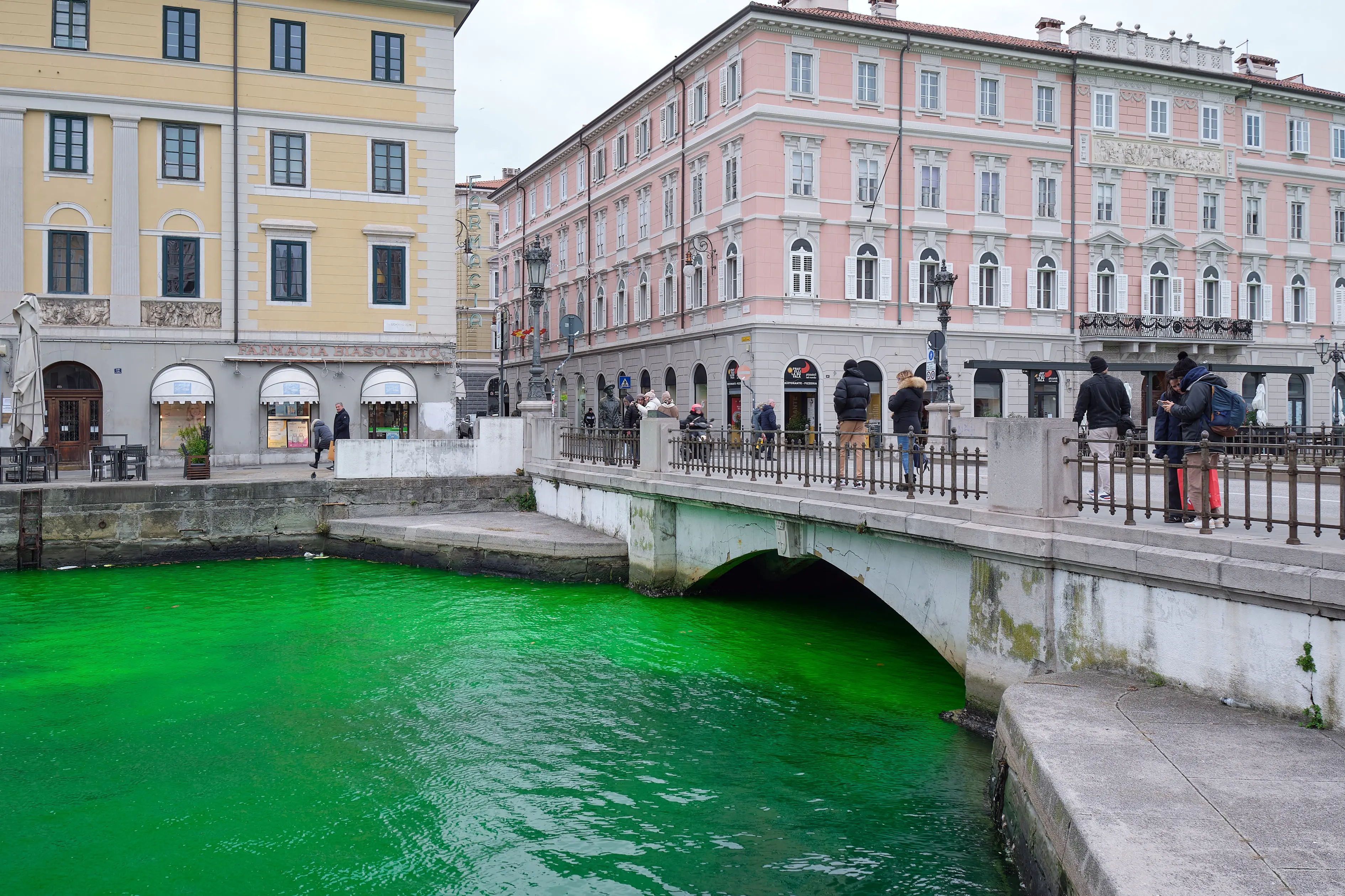 Sabato mattina i gruppetti di turisti a passeggio lungo il Canale di Ponterosso, spazzato dalla bora, sulle prime hanno pensato a una sorta di performance artistica. D’altronde quel verde fluo che di colpo ha tinto il mare poteva far intendere proprio questo.