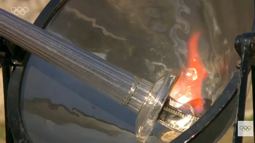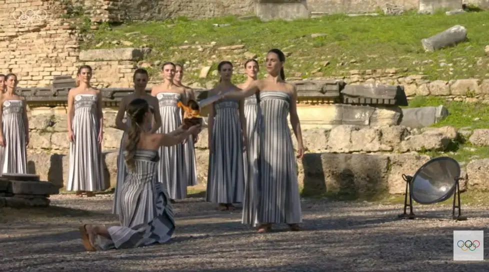 Nata dalla luce di Apollo e dalla terra senza tempo di Zeus, la fiamma incarna l'essenza dell'Olimpismo. Davanti al tempio di Hera, una sacerdotessa invoca il dio Apollo affinché invii la sua luce, catturando i raggi del sole con uno specchio parabolico per accendere la fiamma, simbolo di purezza, pace e continuità eterna dello spirito Olimpico.