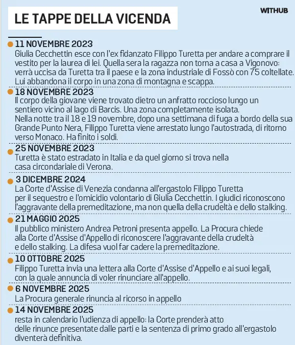 L’udienza della Corte d’Assise d’Appello comunque si aprirà, alle 9.30 del 14 novembre in aula bunker: indetta come udienza pubblica non può essere revocata. Il presidente Michele Medici formalizzerà la rinuncia delle parti e la condanna di Filippo Turetta all’ergastolo diventerà definitiva.
