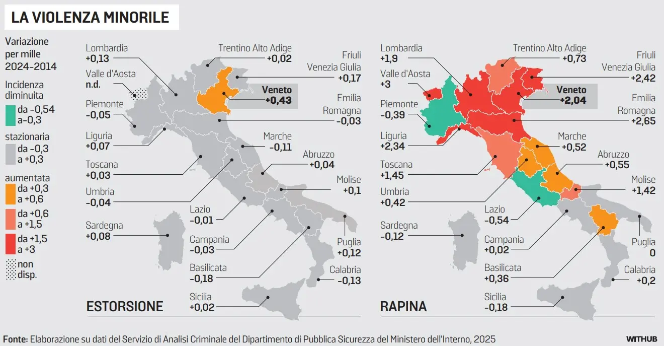 E non va meglio in Friuli Venezia Giulia: qui si registra la crescita più significativa, in rapporto agli altri territori e al totale dei coetanei, delle segnalazioni per minacce e lesioni personali. Torniamo in Veneto: tra il 2014 e il 2024 sale l’incidenza di minori segnalati per alcuni reati: rapina (+2,04 ogni mille abitanti tra i 14 e i 17 anni), lesioni personali (+1,37), minaccia (+0,57) ed estorsione (+0,43). Estorsioni e rapine, in particolare, collocano il Veneto tra le regioni in testa alla classifica. L’unica percentuale in calo è quella dei segnalati per associazione di tipo mafioso (-0,02 ogni mille abitanti tra i 14 e i 17 anni).