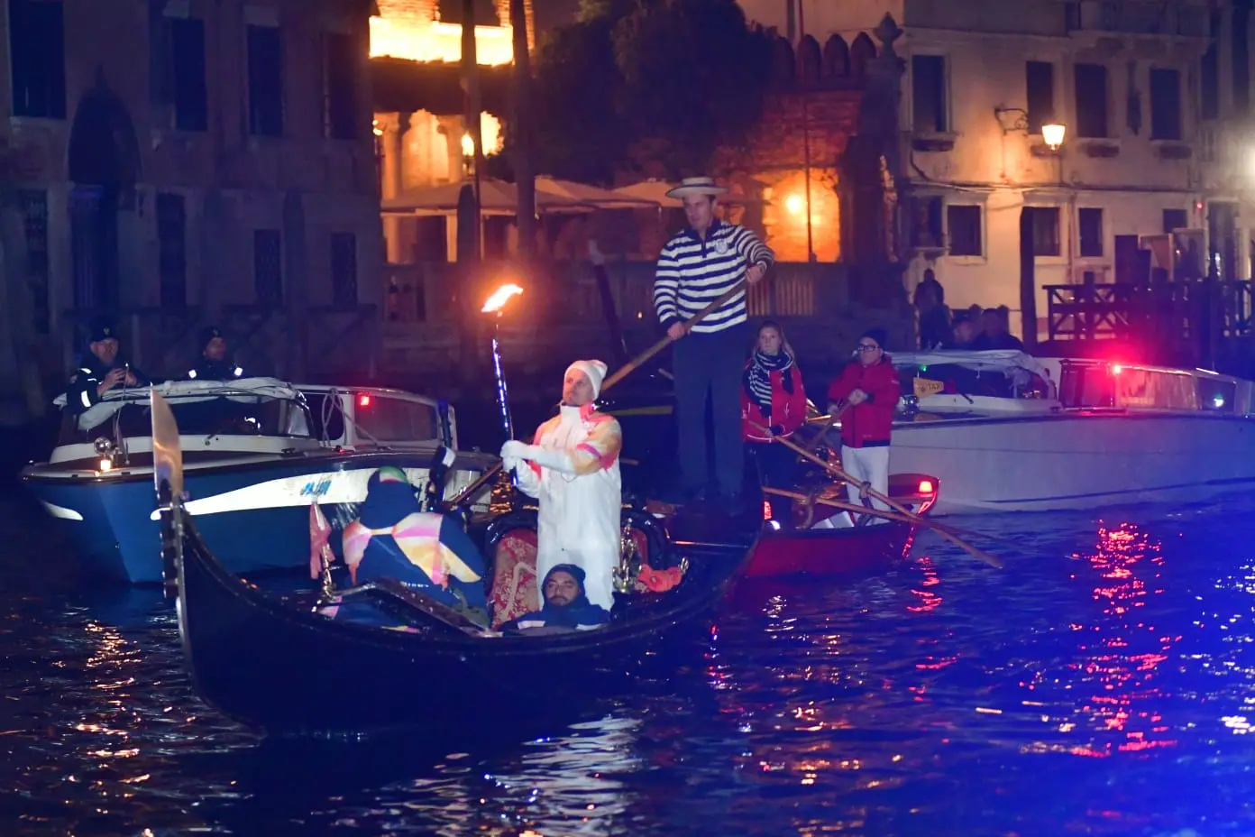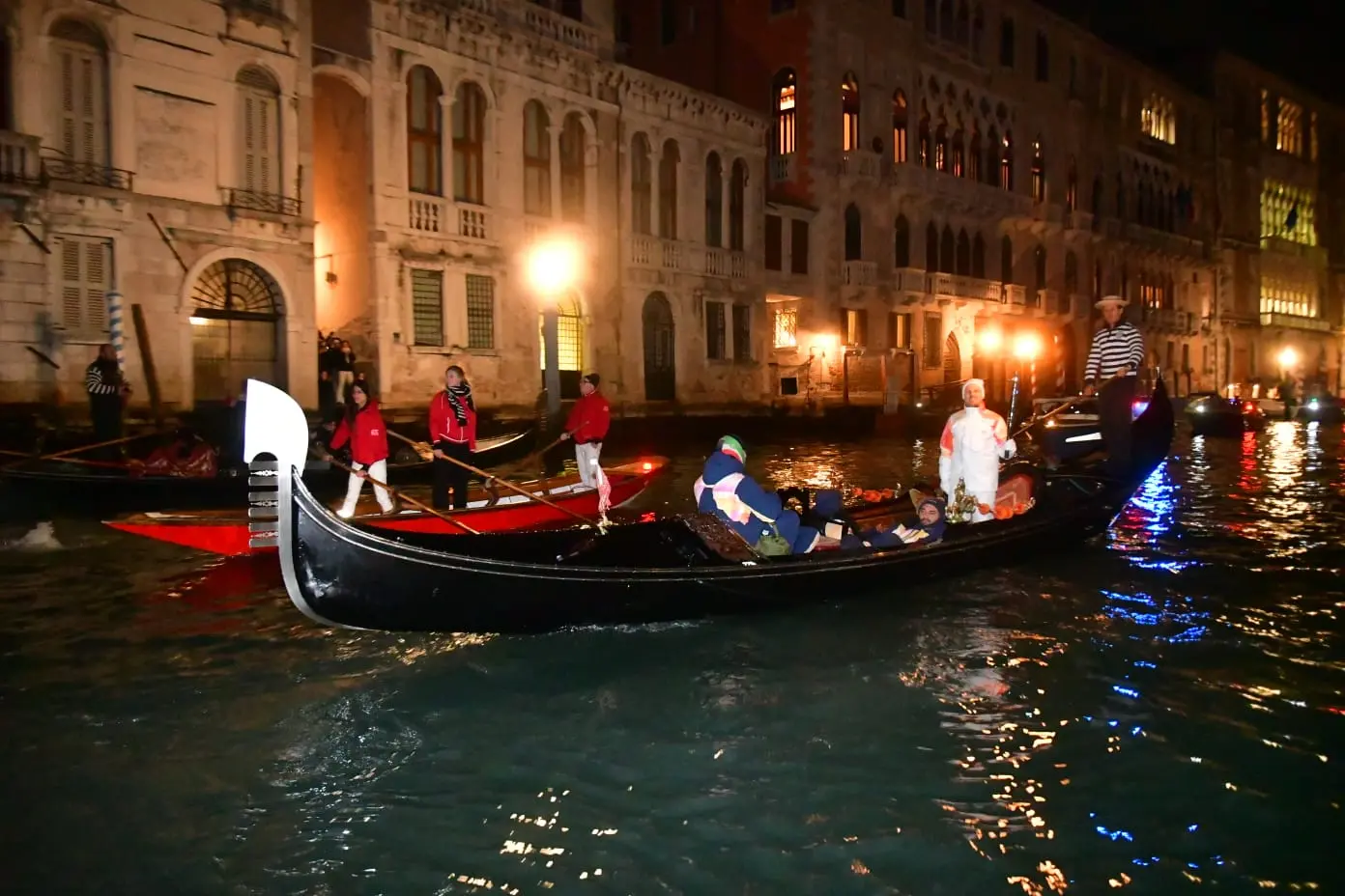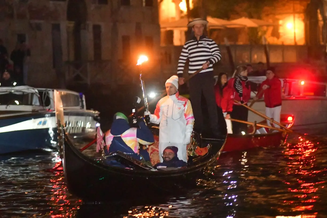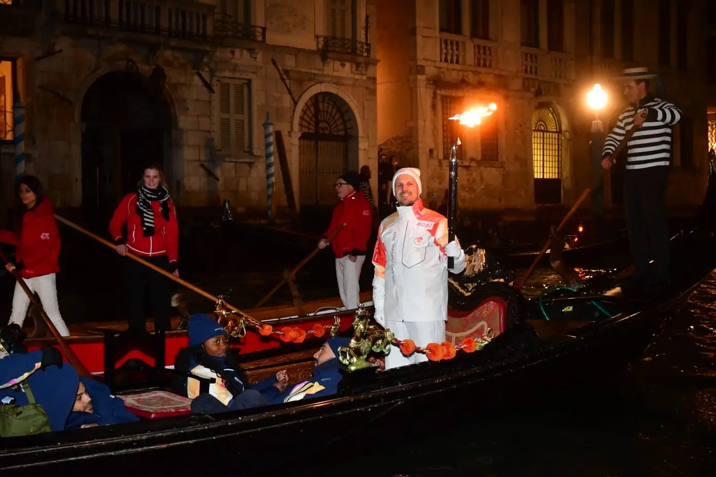 Ancora Fonamenta Ormesini, Strada Nova, sfrecciando a Rialto. Qui l’imbarco dei tedofori a bordo della storica Serenissima, la bissona simbolo identitario di Venezia, e della Dodesona, una gondolona, per scortare la Fiamma a remi. Canal Grande illuminato dal “kiss” davanti a Ca’ Farsetti, da togliere il fiato e paparazzato come non mai.