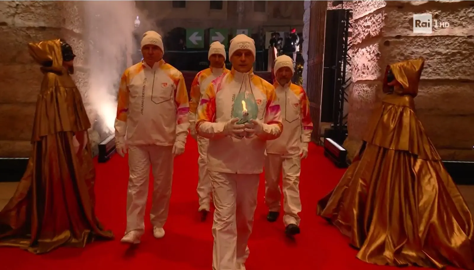 Entra la fiamma. A portarla sul palco sono i leggendari campioni Olimpici della staffetta azzurra di Lillehammer 1994: Maurilio De Zolt, Marco Albarello, Giorgio Vanzetta, e dal sappadino Silvio Fauner. Sono loro ad “accendere” i cerchi olimpici che si stagliano sopra le tribune dell’Arena di Verona. Una presenza, quella di Fauner, che segna la “pace” definitiva tra i celebri fondisti e la Fondazione Milano Cortina. Alla vigilia delle Olimpiadi, infatti, il sappadino si era fatto portavoce della protesta di alcuni grandi dello sport italiano che non erano stati coinvolti come tedofori.