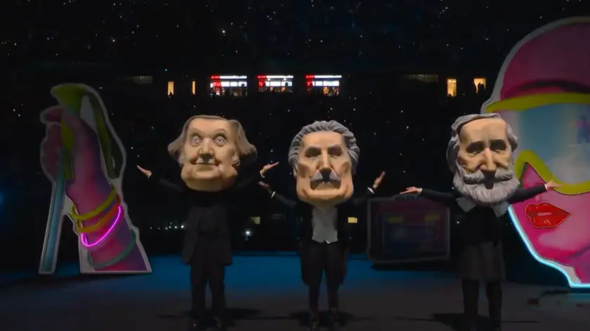 Verdi, Puccini e Rossini trasformati in marionette ballano al ritmo di “Vamos a la playa” dei fratelli Righeira mentre il pubblico (istruito nel warm up) canta “Milano o-oh, Cortina o-oh”. Italian trash, decisamente.