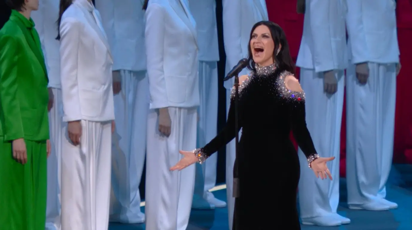 Laura Pausini in abito lungo nero ha intonato l'Inno di Mameli affiancata da una serie di figuranti vestiti con i colori del tricolore. In contemporanea a Cortina un coro di montagna si è esibito sulla stessa melodia.