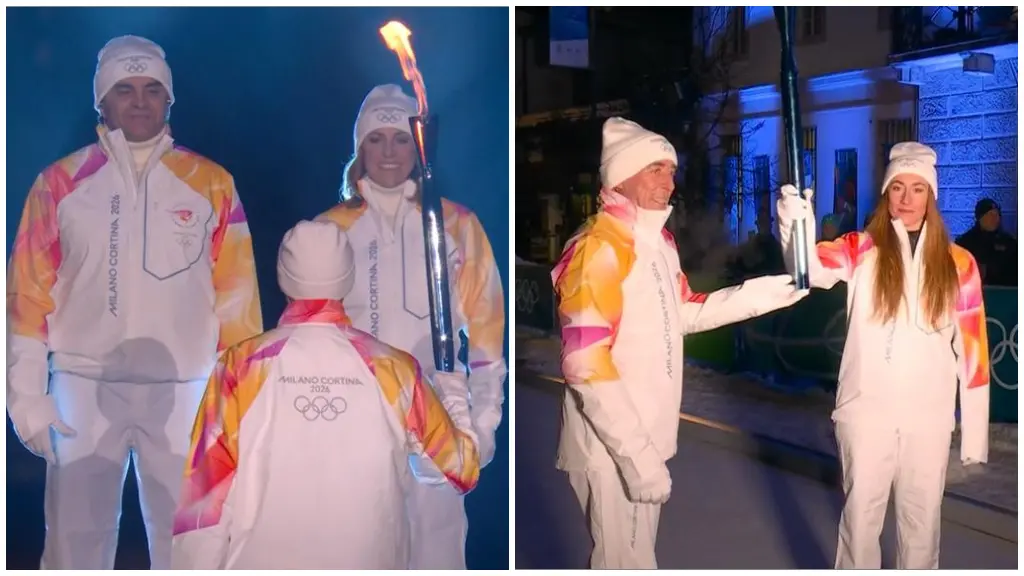 A Cortina, invece, è Sofia Goggia, l'ultima tedofora. Gustavo Thoeni ha portato la fiaccola in piazza Dibona e l'ha consegnata a Goggia, che ha acceso il braciere.