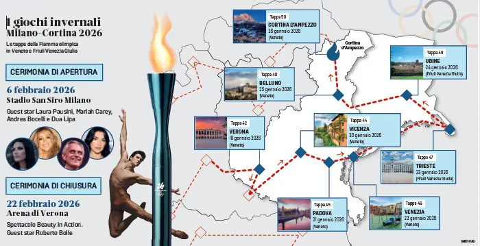 Pure in Veneto, dove il viaggio coinvolgerà 45 municipi e sei siti Unesco. Domenica 18 gennaio, lago di Garda: da Valpolicella a Peschiera, e poi in piazza Bra a Verona, davanti a quell’Arena che chiuderà i Giochi il 22 febbraio. Il 19 la Fiamma ripartirà verso Soave, Villafranca, Valeggio sul Mincio, Isola della Scala, sconfinando brevemente in Lombardia, a Mantova. Il 20 la discesa: Legnago, Adria, Rovigo, Monselice, Este, Abano Terme, Vicenza. Il 21, invece, la salita: Schio, Asiago, Bassano del Grappa, la Marca con Montebelluna, Asolo, Castelfranco, Cittadella, Padova. Il 22 gennaio è acqua e pietra: Chioggia, Treviso, Mestre, Porto Marghera, Venezia, in piazza San Marco. Il 23 si prosegue toccando Musile, San Donà, Concordia Sagittaria, Portogruaro.