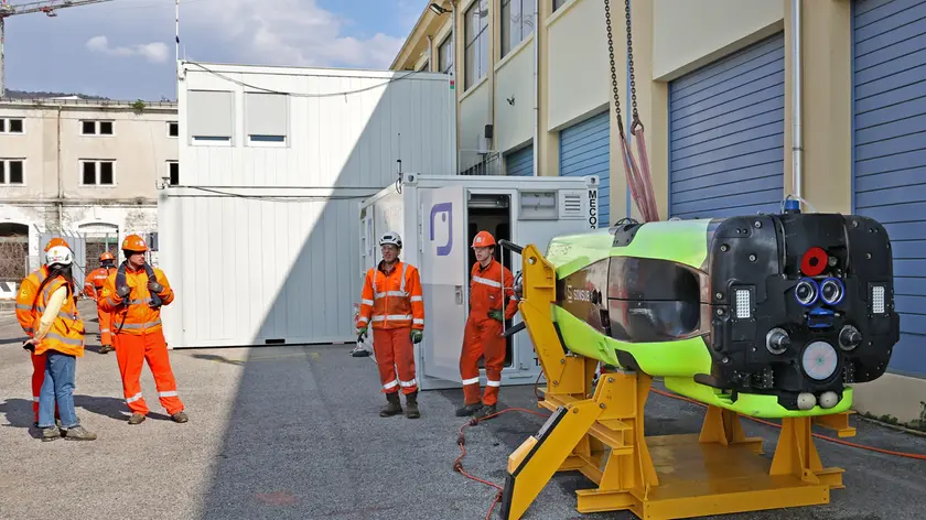 Sulla banchina è piazzato anche il più diffuso dei veicoli subacquei dell’azienda, un esemplare di Remote Operated Vehicle (Rov) giunto a fine corsa e utilizzato oggi per addestrare i tecnici che li useranno in acqua, sia civili che militari. La differenza principale, rispetto ai droni, è quella di essere collegati a una nave in superficie da un cavo di alimentazione e controllo: «Sono veicoli estremamente versatili, necessari per compiere un numero molto ampio di operazioni ma meno autonomi rispetto ai droni. Quando le condizioni del mare sono proibitive e la nave non può stare in zona, il drone lavora tranquillamente sott’acqua senza risentirne. Inoltre, il monitoraggio di infrastrutture molto lunghe è più efficace grazie all’autonomia di movimento, che può arrivare a 24 ore», racconta Massari.