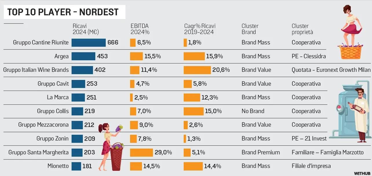 Esaminando ancora le top 10, vediamo come il gruppo più grande sia la cooperativa Cantine Riunite con ricavi, nel 2024, di 666 milioni di euro e un Ebitda del 6,5%, seguita da Argea, proprietà del fondo Clessidra, che ha fatturato 453 milioni. Segue Italian Wine Brands (unica società vinicola, con la veronese Masi, a essere quotata a Piazza Affari) che ha fatturato 402 milioni, quindi altre 4 cooperative (Cavit, La Marca, Collis e Mezzacorona) tra i 212 e i 253 milioni. A seguire il gruppo Zonin (partecipazione di 21 Invest) con 209 milioni, Santa Margherita con 203 milioni e un Ebitda del 29% e Mionetto (filiale d’impresa) con 181 milioni. Il settore vino a Nord Est è importante anche per l’occupazione, visto che ci lavorano 10.545 addetti, in crescita rispetto ai poco più di 9 mila del 2019, con Mezzacorona e Zonin che danno lavoro a più di 500 persone.