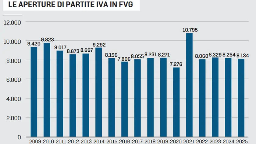 Friuli Venezia Giulia in controtendenza, seppur di poco, rispetto alla media nazionale sul fronte delle nuove partita Iva: il 2025 si è chiuso in calo dell’1,5% rispetto all’anno precedente, con 8.134 aperture, 120 in meno del 2024, mentre a livello italiano si parla di un piccolo incremento dello 0,4%, con la Sicilia che guida la graduatoria con un +11,5%.