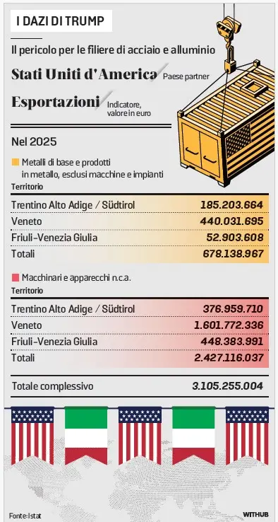 Secondo le prime stime, l’impatto potenziale riguarda in particolare i settori dei prodotti in metallo e dei macchinari, che solo nelle tre regioni del Nord Est esportano negli Stati Uniti beni per oltre 3 miliardi di euro. Il problema non è solo l’aumento delle aliquote doganali, ma l’estensione del perimetro dei prodotti coinvolti.