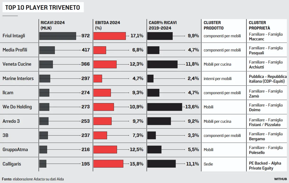 L’azienda ha chiuso il 2024 con 972 milioni di fatturato, in aumento rispetto agli 866 milioni dell’anno precedente, e con un margine Ebitda del 17,1% (era del 16,3% nel 2023), il più alto tra le prime dieci aziende dell’area. Se Friul Intagli è quella con la maggiore marginalità, We Do Holding — gruppo veneto che aggrega cinque società, a partire da Doimo — è invece la realtà più dinamica, con un Cagr del 14% negli ultimi cinque anni.
