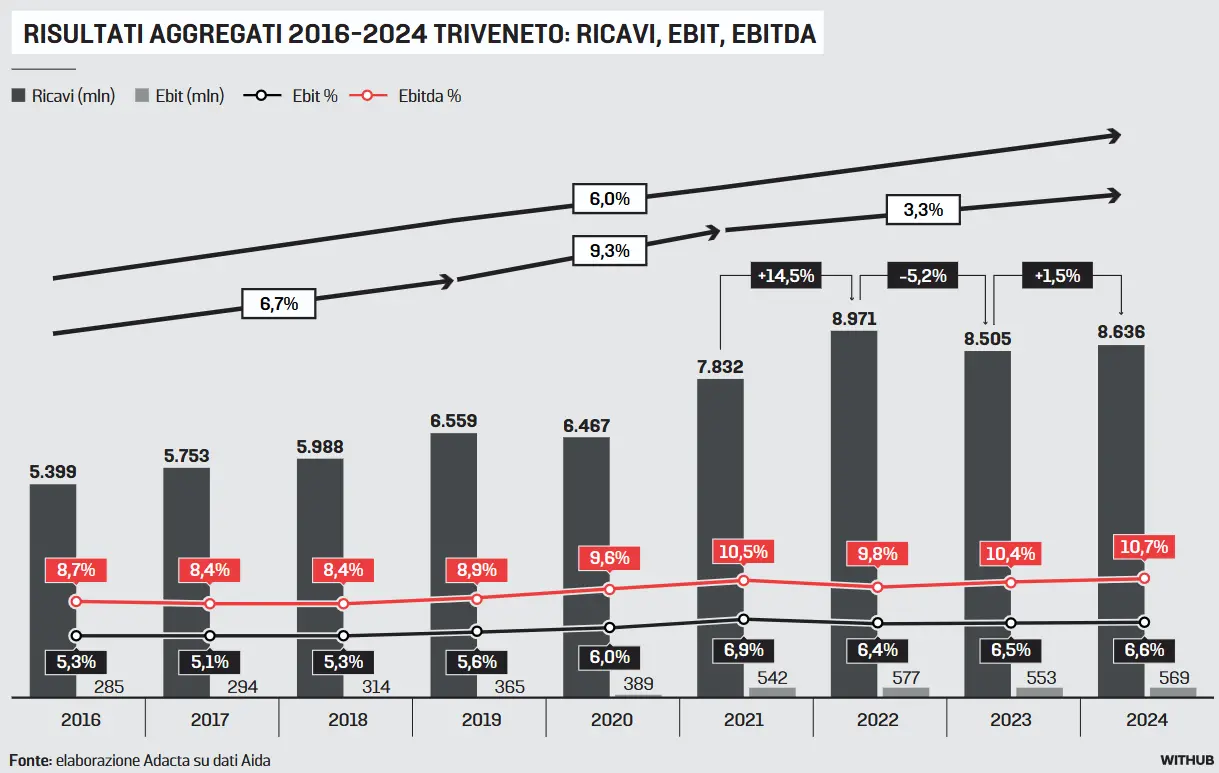 Con 564 aziende attive, il comparto in Triveneto vale, come detto, 8,6 miliardi: un valore aumentato in media del 6% negli ultimi otto anni, con una forte accelerazione nel periodo post-Covid. Il trend positivo ha riguardato anche la redditività: l’Ebitda percentuale è salito dall’8,7% al 10,7%, mentre l’Ebit è passato dal 5,3% al 6,6%.