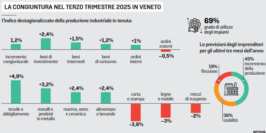 Il terzo trimestre del 2025 consegna un quadro dell’industria veneta sospeso tra resilienza e stagnazione. L’indagine Veneto Congiuntura di Unioncamere del Veneto - realizzata su un campione di 2 mila imprese con almeno 10 addetti, per un totale di oltre 120 mila lavoratori - mostra infatti un sistema produttivo che tiene, ma senza riuscire a imprimere una vera accelerazione.