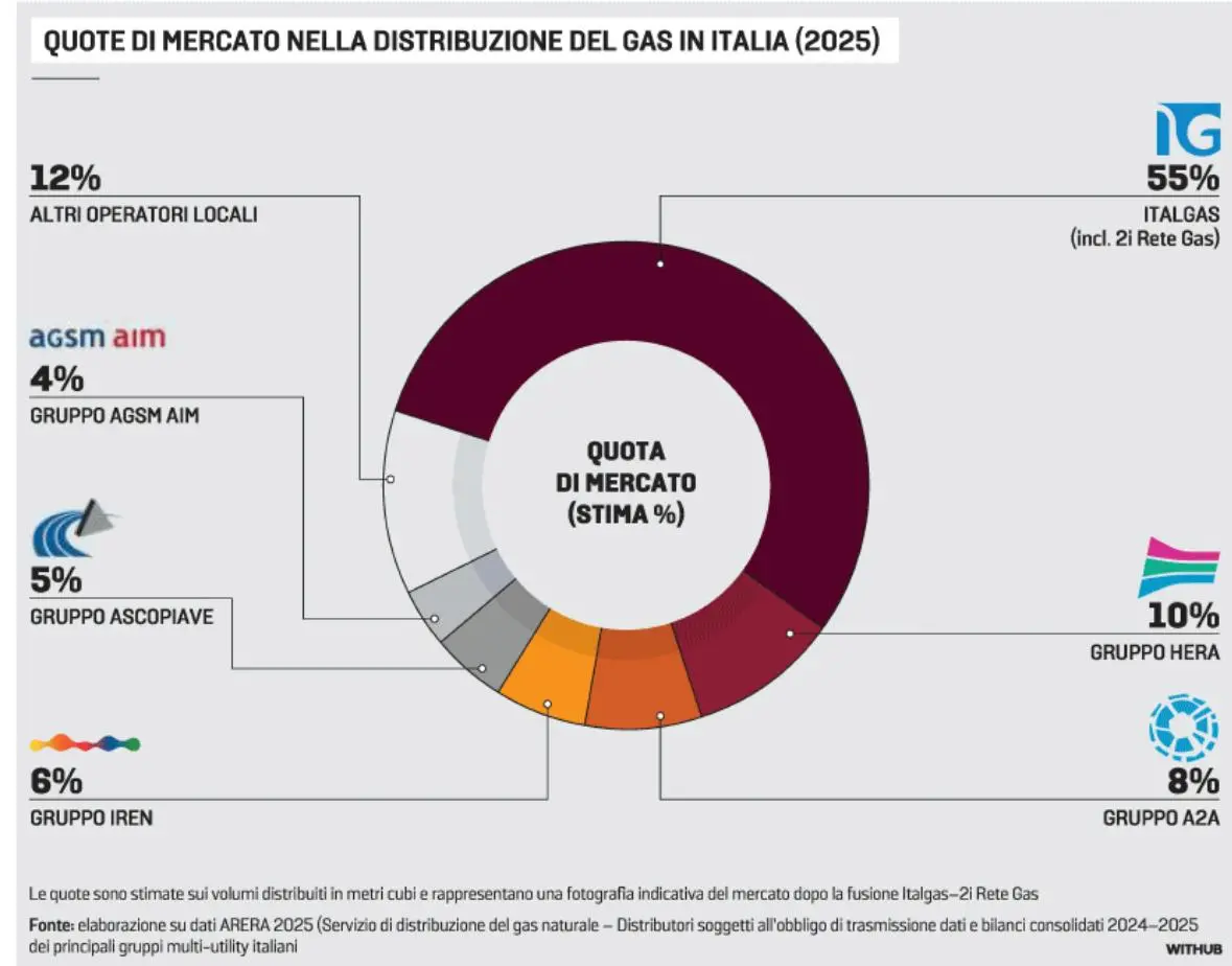 In questo scenario, incrociando i dati di Arera e i bilanci consolidati dei principali gruppi italiani emerge un mercato che si è già fortemente concentrato. Dopo la fusione con 2i Rete Gas, Italgas controlla oggi più della metà del mercato nazionale della distribuzione, con una quota stimata intorno al 55% cento dei volumi complessivi. Al secondo posto si colloca Hera, gruppo bolognese con forti interessi a Nord Est, con circa il 10% attraverso le società operative Inrete Distribuzione Energia e AcegasApsAmga. Seguono A2A con l’8%, Iren con il 6%, la trevigiana Ascopiave con il 5% e la veronese Agsm Aim con il 4%.