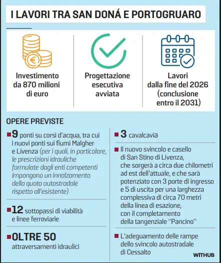 Al termine della progettazione, della sua verifica e della sua conseguente approvazione da parte del commissario delegato, potranno essere avviati i lavori, che – cronoprogramma alla mano – dovrebbero prendere il via nella seconda parte del 2026 quando dovrebbe concludersi contestualmente il cantiere di rifacimento dei cavalcavia attualmente in realizzazione sullo stesso tratto tra Portogruaro e San Donà di Piave. I lavori di ampliamento autostradale saranno avviati a partire da San Donà di Piave, in continuità con il tratto già ampliato con la terza corsia, procedendo quindi verso est, e gli stessi comprenderanno fin da subito la realizzazione del nuovo svincolo e casello di San Stino di Livenza.