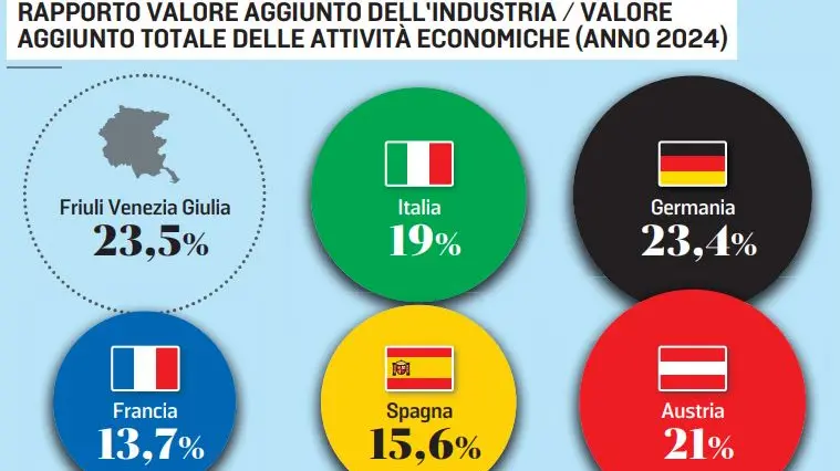 Dietro alle parole di Pozzo i dati Istat ed Eurostat elaborati dall’ufficio studi di Confindustria Udine, a partire dalla quota di valore aggiunto generata dall’industria, pari al 23,5%, un peso ben superiore alla media nazionale, che si attesta al 19%, e leggermente superiore perfino a quella della Germania, il 23,4%, quasi doppia rispetto alla Francia (13,7%) e sensibilmente superiore anche rispetto alla Spagna (15,6%) e alla vicina Austria (21%). Anche il mercato del lavoro conferma il ruolo strategico dell’industria, che pesa quasi per un quarto (24,1%) sul totale degli occupati, 127mila rispetto a un’occupazione media che nel corso del 2025 si è attestata a quota 526mila. Occupati, rincara Pozzo, «con retribuzioni mediamente più elevate», in un settore che «offre posti di lavoro qualificati con un’intensità superiore a qualsiasi altro comparto economico».