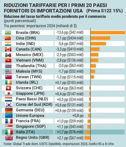 Va a finire che si stava meglio prima, quando si stava peggio. Dalla mezzanotte, sulle merci che entrano negli Stati Uniti grava un dazio piatto del 10 per cento, elevato al 15 per cento per 150 giorni, uguale per tutti, e (al momento) senza eccezioni. Secondo i calcoli degli esperti indipendenti di Global Trade Alert (Gta) la mossa assegna un clamoroso successo per la Cina che incassa uno sconto di sette punti sui livelli attuali (dal 36,8 al 29,7 per cento), attribuisce un moderato ribasso all’Unione europea (0,8 punti) e ci segnala come il Paese continentale destinato a pagare il più alto pedaggio.
