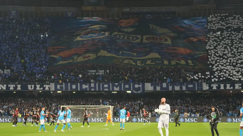(ANSA) - ROMA, 06 APR - Nel posticipo del 31/o turno della Serie A, il Napoli batte 1-0 il Milan al Maradona, scavalcando i rossoneri e portandosi a -7 dall'Inter capolista, quando mancano 7 giornate alla fine. Decide Politano che al 34' della ripresa, su un cross allontanato male di testa da De Winter, colpisce di controbalzo col mancino e batte Maignan. (ANSA).
