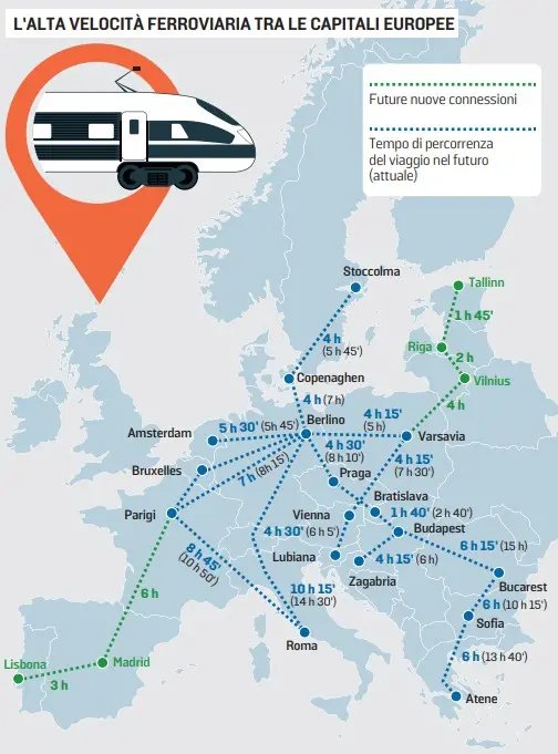 Il progetto nasce - per prescrizione del regolamento Ue del 2024 di «Orientamenti per lo sviluppo della rete transeuropea di trasporto» - con finalità prima di tutto ambientali: dare alternativa modale ferroviaria al trasporto stradale e a quello aereo sulle medie distanze. Ma può diventare molto di più: lo strumento di incremento della competitività dell’intera economia europea perché capace di aumentare l’efficienza produttiva delle sue grandi città: obiettivo intermedio decisivo nell’era dell’economia della conoscenza.