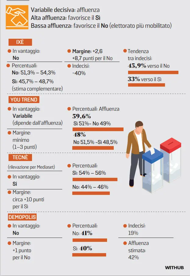 Un sorpasso previsto già da alcuni sondaggisti: ma non da altri, in un pendolo di previsioni che fotografa ancora un sostanziale testa a testa. La rete invece fotografa bene il trend: il Sì resta in testa, ma il No mobilita di più. I testimonial fanno la differenza.