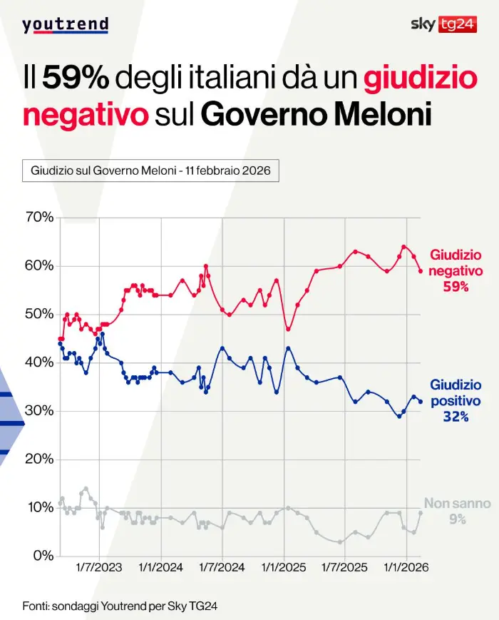 Intanto il 59% degli italiani esprime un giudizio negativo sul Governo Meloni, contro il 32% che dà un giudizio positivo.