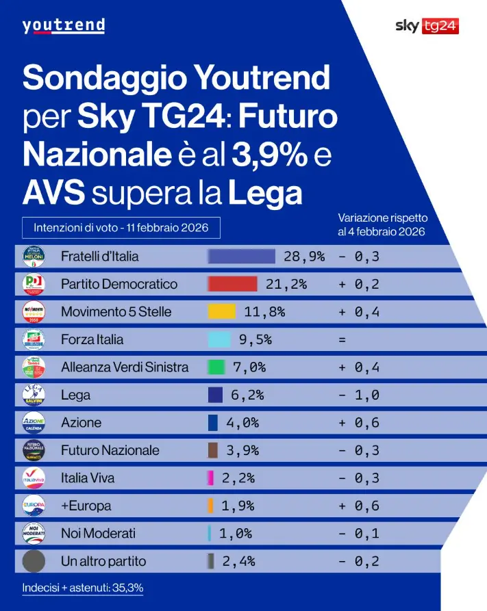 Nel sondaggio Youtrend per Sky TG24 diffuso mercoledì 11 febbraio, Futuro Nazionale è al 3,9%, sottraendo consensi soprattutto alla Lega (6,2%), che viene sorpassata da Alleanza Verdi Sinistra (7,0%). Fratelli d'Italia continua a restare in testa nelle intenzioni di voto (28,9%), davanti a Partito Democratico (21,2%), Movimento 5 Stelle (11,8%) e Forza Italia (9,5%).