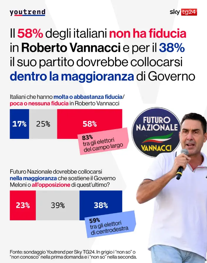 Su Vannacci, il 58% degli intervistati ha poca o nessuna fiducia in lui - e si sale all'83% tra gli elettori del campo largo - mentre il 38% pensa che il suo partito dovrebbe collocarsi all'interno della maggioranza che sostiene il Governo Meloni - e il dato cresce al 59% tra gli elettori delle forze di centrodestra.