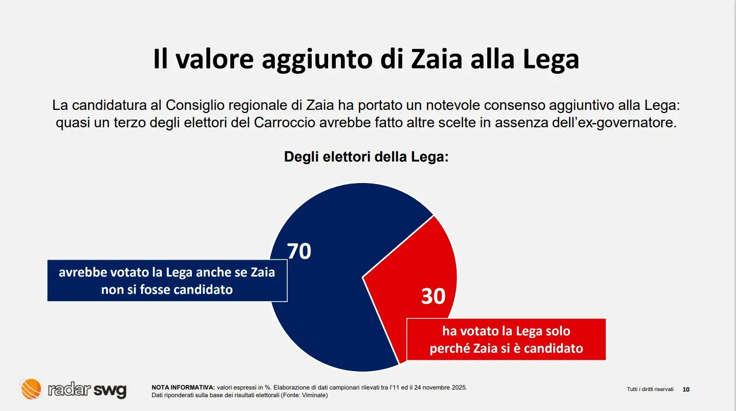 Dove a livello nazionale Fratelli d’Italia continua a rappresentare il baricentro politico del centrodestra, in Veneto la partita è stata stravinta dal radicamento territoriale di Zaia, capace di incidere più delle dinamiche romane. E la Lega, pur dimezzata nei voti complessivi rispetto al milione e 200 mila raccolti nel 2020 (considerando anche la lista Zaia), ritrova un risultato competitivo, impossibile da spiegare senza la forza personale del governatore.