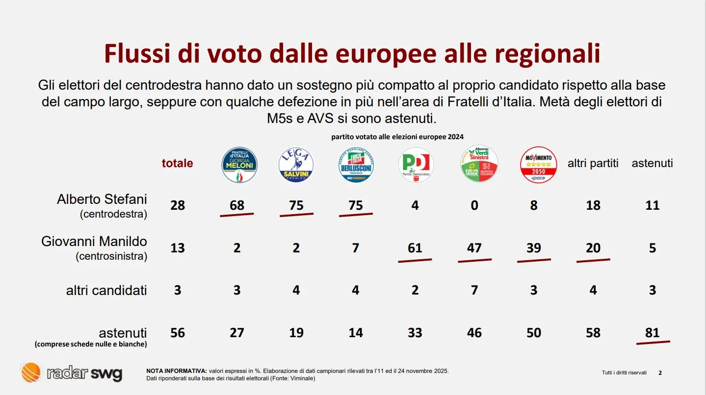 Dall’altro lato, la Lega: un lento declino negli ultimi anni — dal 16,9% delle Regionali 2020 al 13,1% delle Europee 2024 — che sembrava preannunciare un sorpasso inevitabile. E invece il 2025 ribalta lo schema: la Lega risale fino al 36,3%, tornando a essere primo partito regionale.