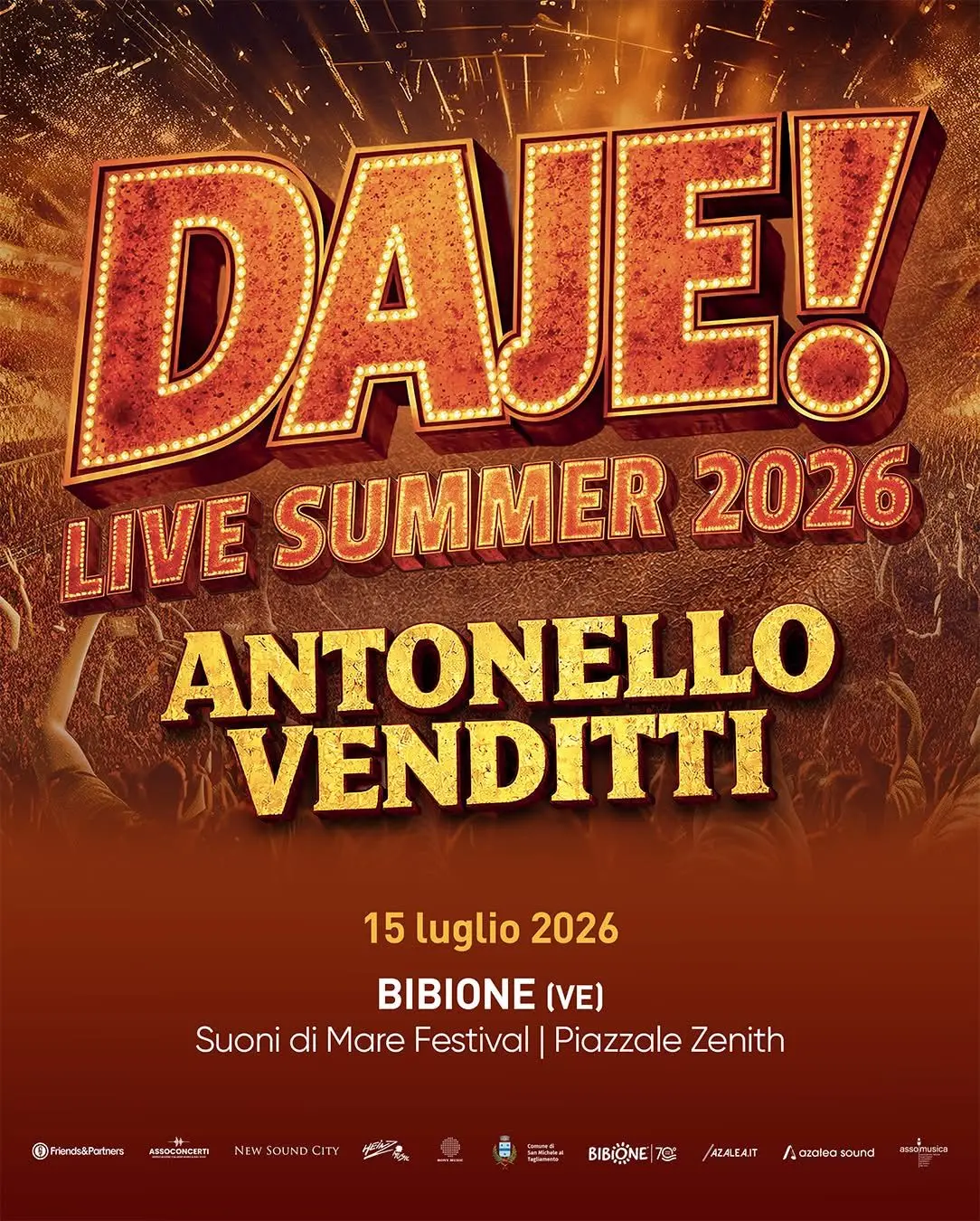 Ufficializzata la data del concerto di Antonello Venditti a Bibione: il cantautore si esibirà il 15 luglio 2026 in piazzale Zenith per il “Daje – live summer tour”. Biglietti in vendita su TicketOne