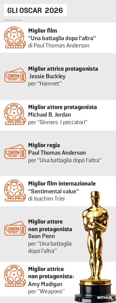 “Una battaglia dopo l’altra” di Paul Thomas Anderson e “I peccatori” di Ryan Coogler sbancano, come da previsioni, la 98esima edizione dei premi Oscar. Un trionfo assoluto per Warner Bros., la major che li ha prodotti. Ma, forse, anche il suo canto del cigno, visto che il colosso americano è stato recentemente acquisito dalla Paramount, operazione societaria capace di ridisegnare assetti e stabilire nuovi poteri.