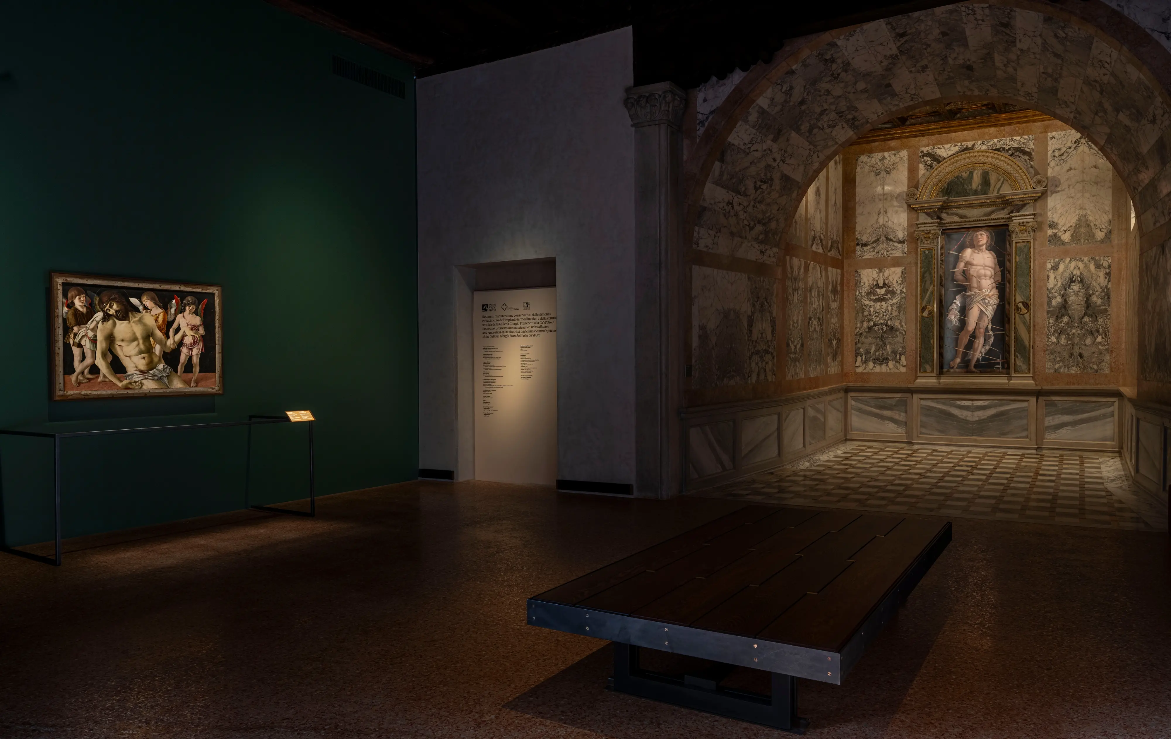 Alla Ca’ d’Oro la “Pietà” di Giovanni Bellini risplende dell’oro, della luce e della dolcezza dei tratti degli angeli bambini che sorreggono Cristo in un contesto in cui il dolore ha lasciato il posto alla pietas. A poca distanza, nella originaria cappella che il barone Franchetti stesso ideò, il “San Sebastiano” di Andrea Mantegna svetta nella sua statuaria potenza. Va detto che la mostra - curata da Toto Bergamo Rossi, direttore di Venetian Heritage, Giovanni Sassu, già direttore del Museo della Città di Rimini, e Luigi Tonini, ora direttore dei Musei di Cento - si inserisce in un contesto molto speciale: è l’ultimo atto prima della chiusura temporanea della galleria, per concludere il cantiere di restauro e riallestimento totale del museo, finanziato sempre da Venetian Heritage insieme alla Fondazione Sacchetti. Un impegno complessivo di otto milioni e mezzo di euro per un progetto che ha coinvolto gli apparati decorativi e strutturali del palazzo, ma anche il nuovo allestimento della collezione permanente. Per la riapertura l’appuntamento è alla primavera del 2027, «e sarà in concomitanza con il centenario dall’inaugurazione del 1927», sottolinea Claudia Cremonini, direttrice della galleria Giorgio Franchetti.