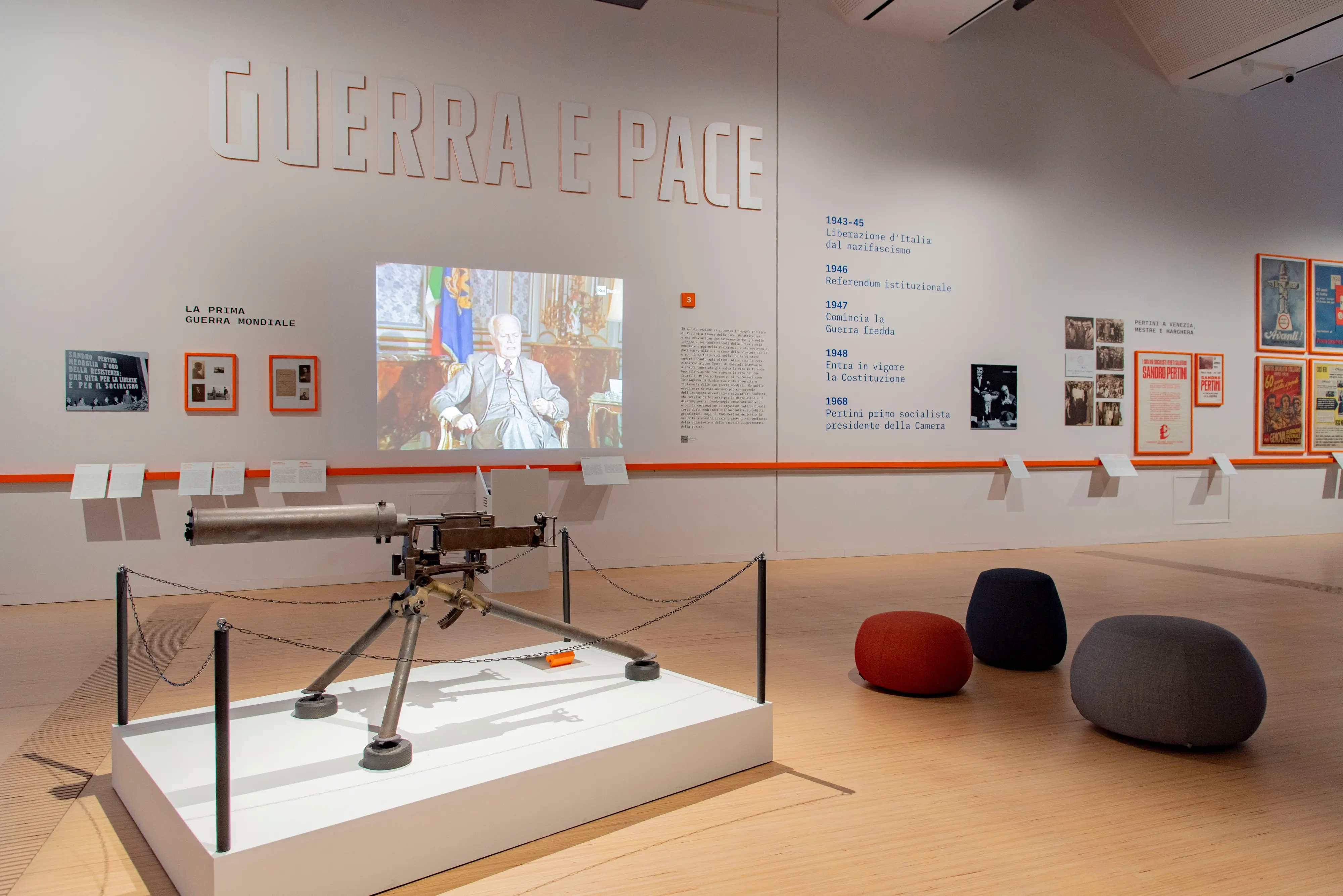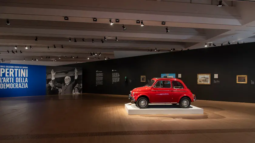La mostra, curata dalla direttrice di M9 Serena Bertolucci e dal suo staff (Luca Bocicchio, Michelangela Di Giacomo, Livio Karrer e Giuseppe Saccà) e aperta sino al 31 agosto 2026, si divide in sette sezioni ed è scandita da due aree colorate in modo differente a sancire d’un lato l’arte e la collezione, in nero, dall’altra le vicende biografiche, le foto, i manifesti dell’epoca, i documenti, esposti su pareti bianche, con scritte rosse. E quindi ecco d’un lato la ricostruzione dell’uomo, del politico, guerra e pace, dall’altra il prigioniero, il partigiano e infine il presidente, fino al mito, ancor oggi vivo e che questa mostra rilancia, se ce ne fosse stato bisogno, a 35 dalla morte e a 130 anni dalla sua nascita, nel 2026, anno in cui ricorreranno anche gli 80 anni della Repubblica.