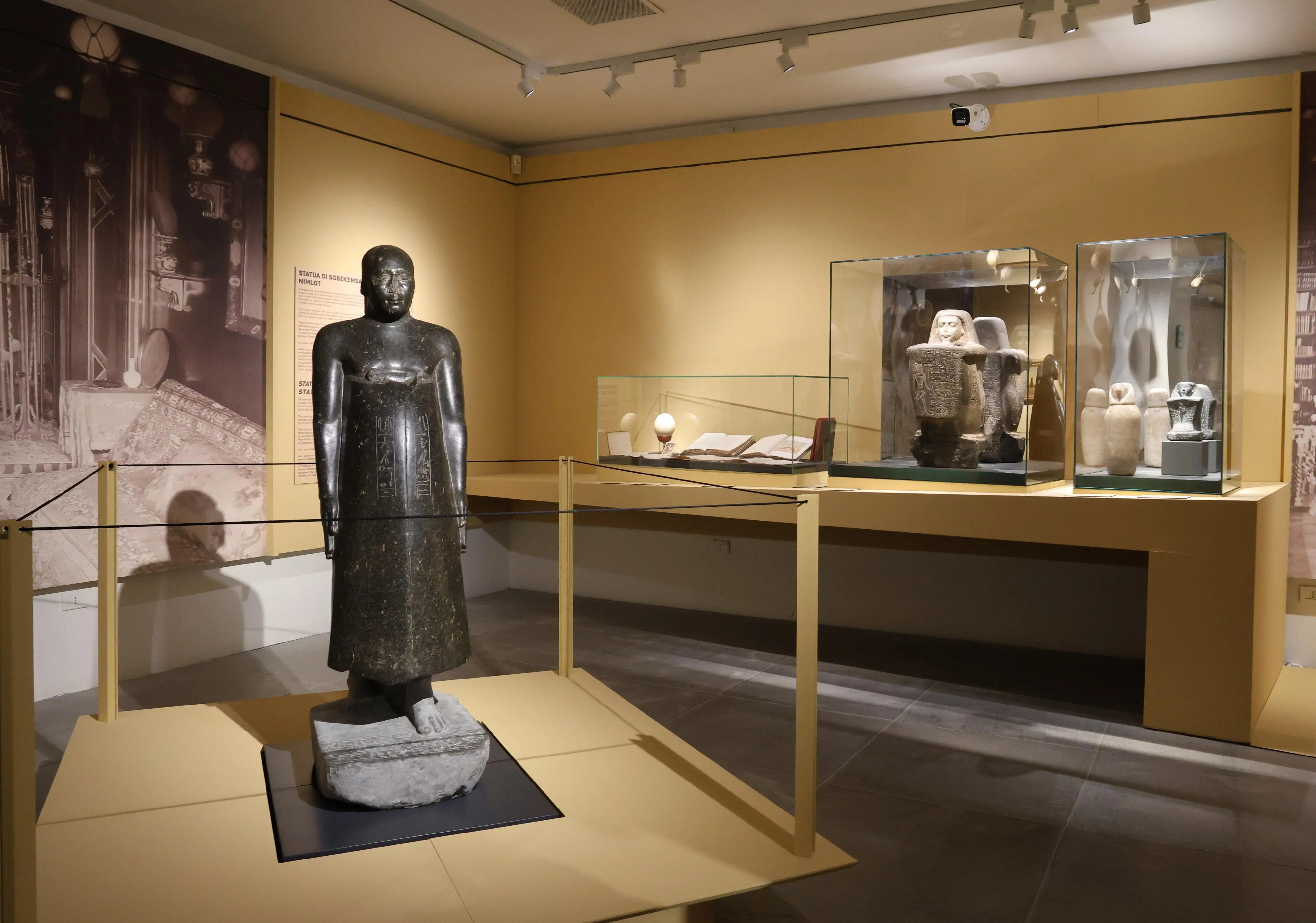 La passione per l’arte egizia dell’arciduca, cominciata con l’acquisto di vari reperti già qualche anno prima, venne sicuramente incrementata da quel viaggio compiuto quale comandante della Marina austriaca da Trieste fino ad Alessandria d’Egitto, con visita a Il Cairo, Giza, Suez. L’intero itinerario era stato documentato dal fotografo Franz Mai, incaricato dalla imperialregia stamperia di Vienna: alcune di queste foto vengono riproposte nella seconda sala dove si illustra pure la moda orientalista che contraddistinse l’arredamento di molte dimore del tempo, la ricca biblioteca del Castello di Miramare o la sala moresca del Castelletto. Da un’immagine di quest’ultima riprodotta a piena parete si scorgono appesi al soffitto i festoni con uova di struzzo, decorazioni considerate benauguranti nel Nord Africa, riproposti pure nella sala della mostra, e il dipinto di Alois Schönn raffigurante i due “Colossi di Memnone”, sempre qui esposto. Tra i reperti della collezione dell’arciduca domina al centro la statua di grandezza quasi naturale in granodiorite che raffigura l’alto funzionario Sobekemsaf con un volto espressivo, testa rasata e corpo robusto, segno del suo rango elevato. Accanto a questa, la statua di Nimlot e i testi dell’egittologo e professore viennese Simon Leo Reinisch al quale l’arciduca affidò la catalogazione della sua collezione.