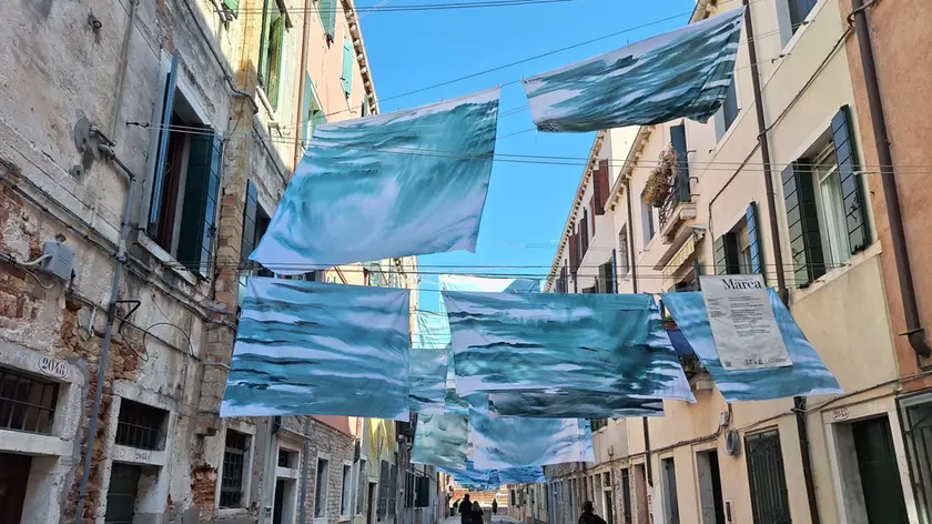Sventolano sulle ali di una leggera bora le lenzuola stese al sole lungo la Calle Nova, riportando un’immagine di Venezia che appare sempre più lontana e schiacciata dall’orda dell’overtourism che ne ha snaturato la semplicità delle abitudini e cancellato la memoria delle tradizioni. A Castello, tra i Giardini della Biennale e l’Arsenale, in una laterale di via Garibaldi, fino al 10 maggio, “Marea” si offre come un’onda che avanza implacabile nel progetto di arte partecipata ideato dall’artista interdisciplinare newyorchese Melissa McGill che propone una settantina di lenzuola - matrimoniali, singole, king e queen size - che non sono quelle dei B&B, ma, sfumate nei toni dell’azzurro-verde si aprono come metafora cromatica che nasconde sotto i panni stesi sulle tagge un cuore ed un’anima verace ancora pulsanti.