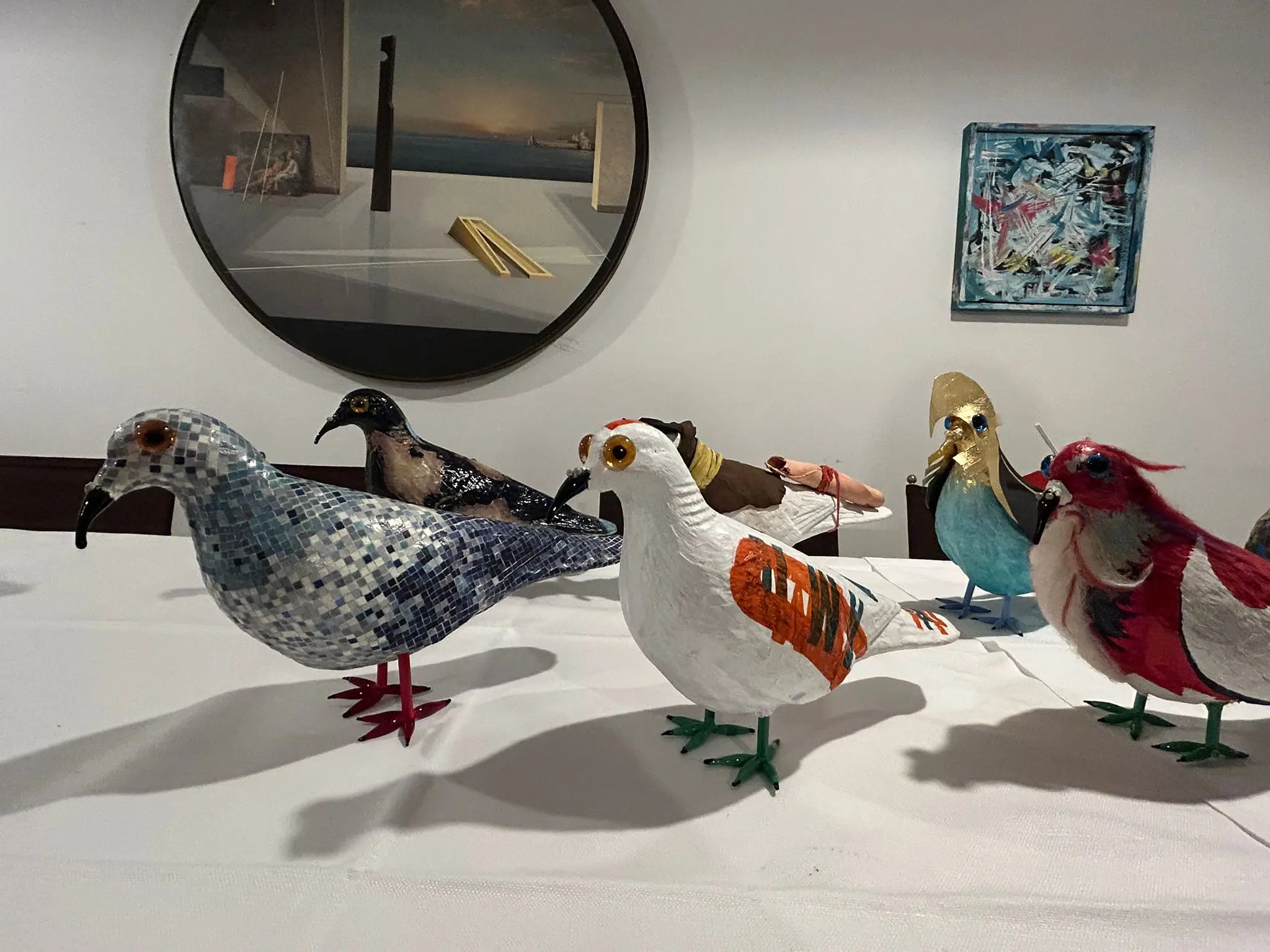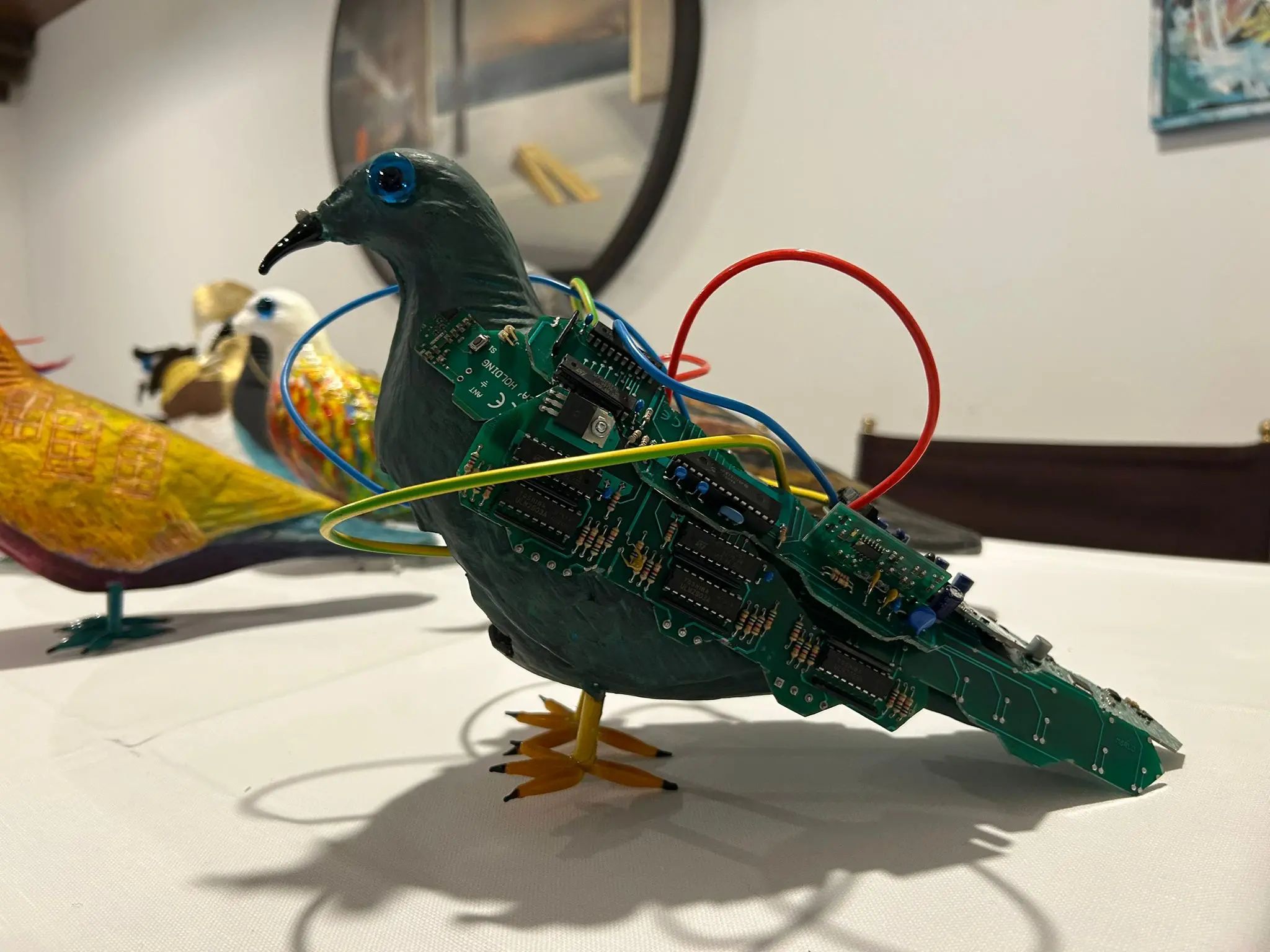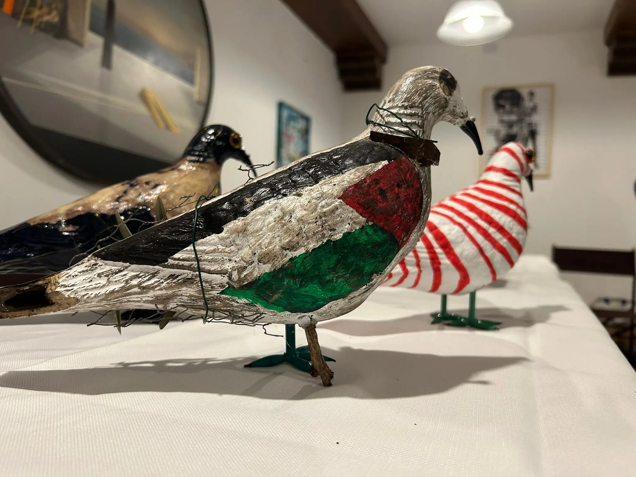 Decorati con vetri di Murano, avvolti in fili elettrici o dipinti con i colori della bandiera palestinese. La galleria dei pennuti iscritti al concorso Volo del Colombo immaginario