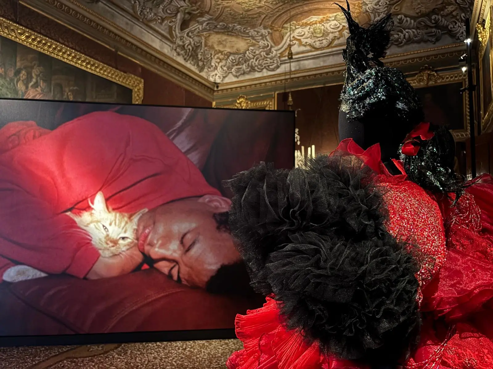 Il leitmotiv della fondazione si è tradotto nella sua prima esposizione, “The Only True Protest is Beauty” (L’unica vera protesta è la bellezza, aperta dal 25 aprile fino al 4 ottobre) una citazione tratta dal cantautore e attivista statunitense Phil Ochs. «È nato come titolo di lavoro un anno fa, oggi è ancora più attuale», continua Van Noten, «vogliamo concentrarci sulla bellezza, senza dare risposte ma mettendo alla prova chi entra». Il palazzo, dopo una prima fase di restauri, si apre quindi come uno scrigno ovattato, dove in ogni sala (una ventina tra primo e secondo piano, con 200 opere) gigantografie di Steven Shearer vengono messe a confronto con capi d’archivio di haute couture firmati da Christian Lacroix e Comme des Garçons, sculture e installazioni di artisti contemporanei, ma anche selezioni di giovani designer e stilisti e gioielli di Codognato.