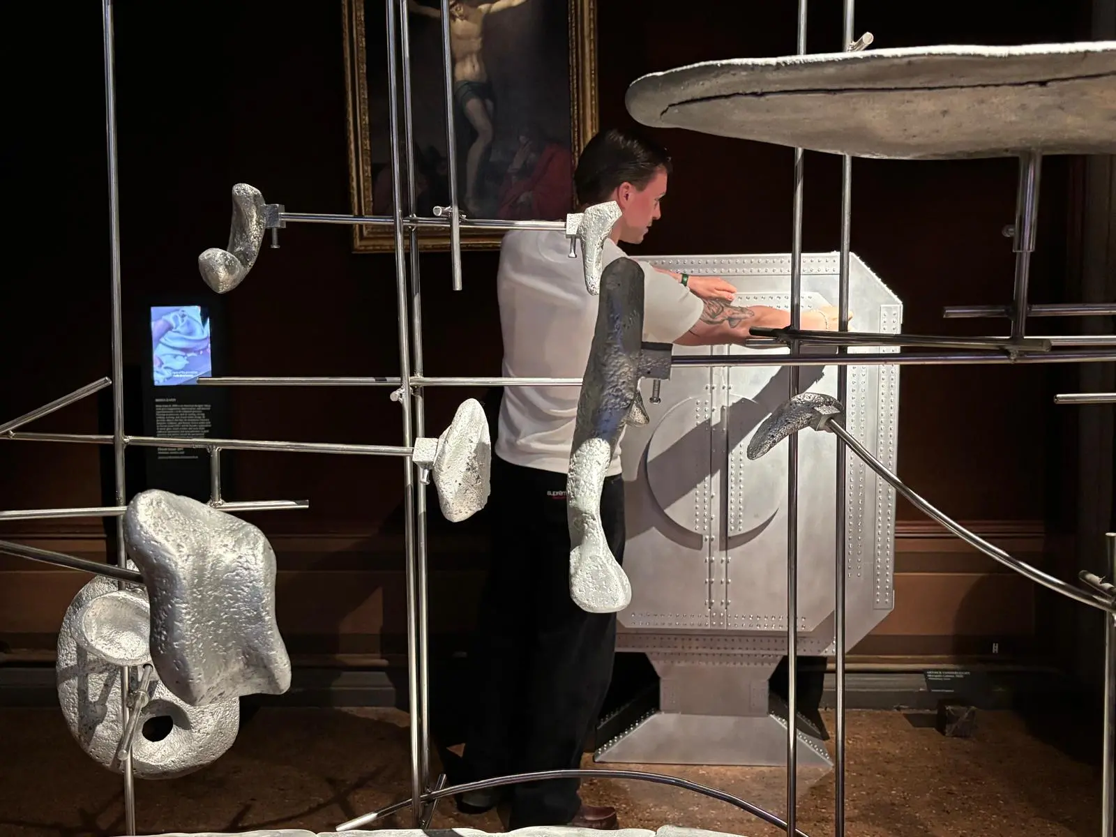 L’effetto è straniante, con una cura del dettaglio estrema. Ma non è solo una questione estetica: tra le sale emergono anche i conflitti e le crisi che affronta il mondo contemporaneo. Ayham Hassan ha 27 anni, è uno stilista palestinese di Ramallah. «Il mio abito racconta la realtà del genocidio», spiega Hassan, «c’è il magenta, il colore di Gaza, dove non posso entrare: un punto di rosso che non puoi non notare, ma nemmeno odiare». Il vestito è fatto di strati su strati, come un manto protettivo. «Cerco di creare bellezza nel mondo violento che mi circonda. Vivo a Londra, ma i miei artigiani sono in Palestina». Gli scontri tra popoli emergono nell’opera di Richard Stipl, che esplora la forma umana nella sezione Skin (pelle): ecco alcuni volti distorti, che rievocano anche la guerra tra Russia e Ucraina.
