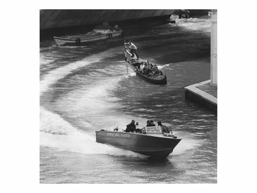 Alcune di esse godono di un particolare punto di osservazione: uno spettacolare angolo sul Canal grande, proprio di fronte alle Fabbriche sansoviniane del Tribunale, all’ultimo piano di palazzo Bollani, dove Berengo Gardin fu spesso ospite di dell’amico Renato Padoan (1924-2017), figura molto nota in città per esser stato anche Soprintendente ai monumenti. La frequentazione del palazzo portò in dote al fotografo anche la scoperta che proprio in quelle stanze aveva vissuto Pietro Aretino, l’intellettuale rinascimentale che nel 1537 descriveva il transito sul Canal Grande.