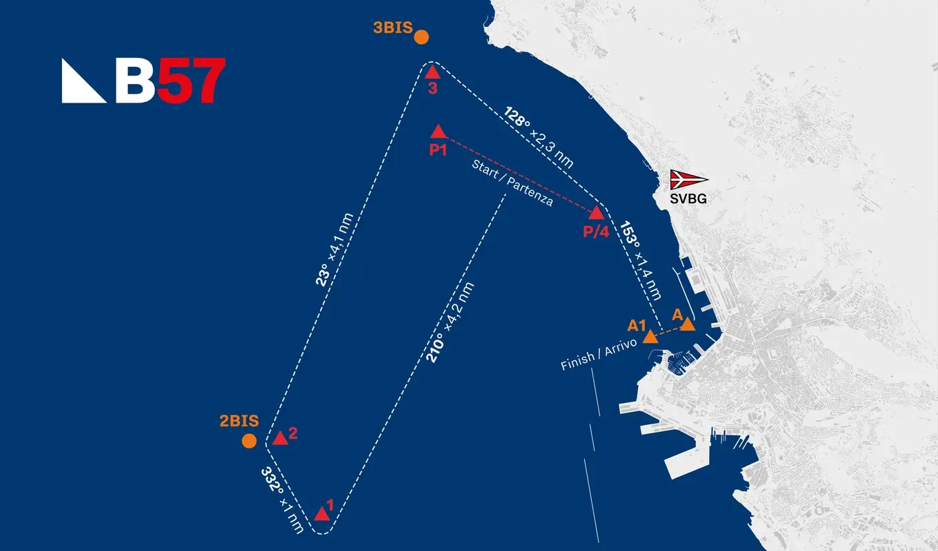 La partenza è fissata alle 10.30 di domenica 12 ottobre e la linea è posizionata tra Barcola e Miramare; si procede per 210 gradi, per 4,3 miglia nautiche, fino a raggiungere la prima boa, quindi segue un disimpegno di 0,90 miglia, per 332 gradi. Da Boa 2 a Boa 3, al largo del Castello di Miramare, si naviga per 4 miglia, quindi si torna verso Barcola, lungo la costa, per 2,3 miglia.