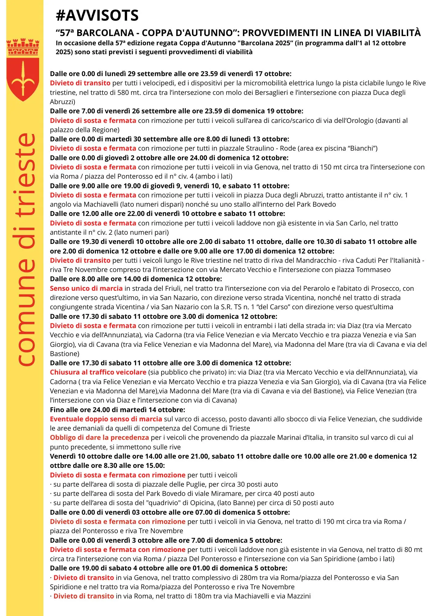 La Barcolana ha come sempre un grande impatto sulla viabilità cittadina, con divieti e chiusure che dureranno tutto il weekend e a cui gli automobilisti devono prestare attenzione. Le Rive in particolare verranno chiuse al traffico: