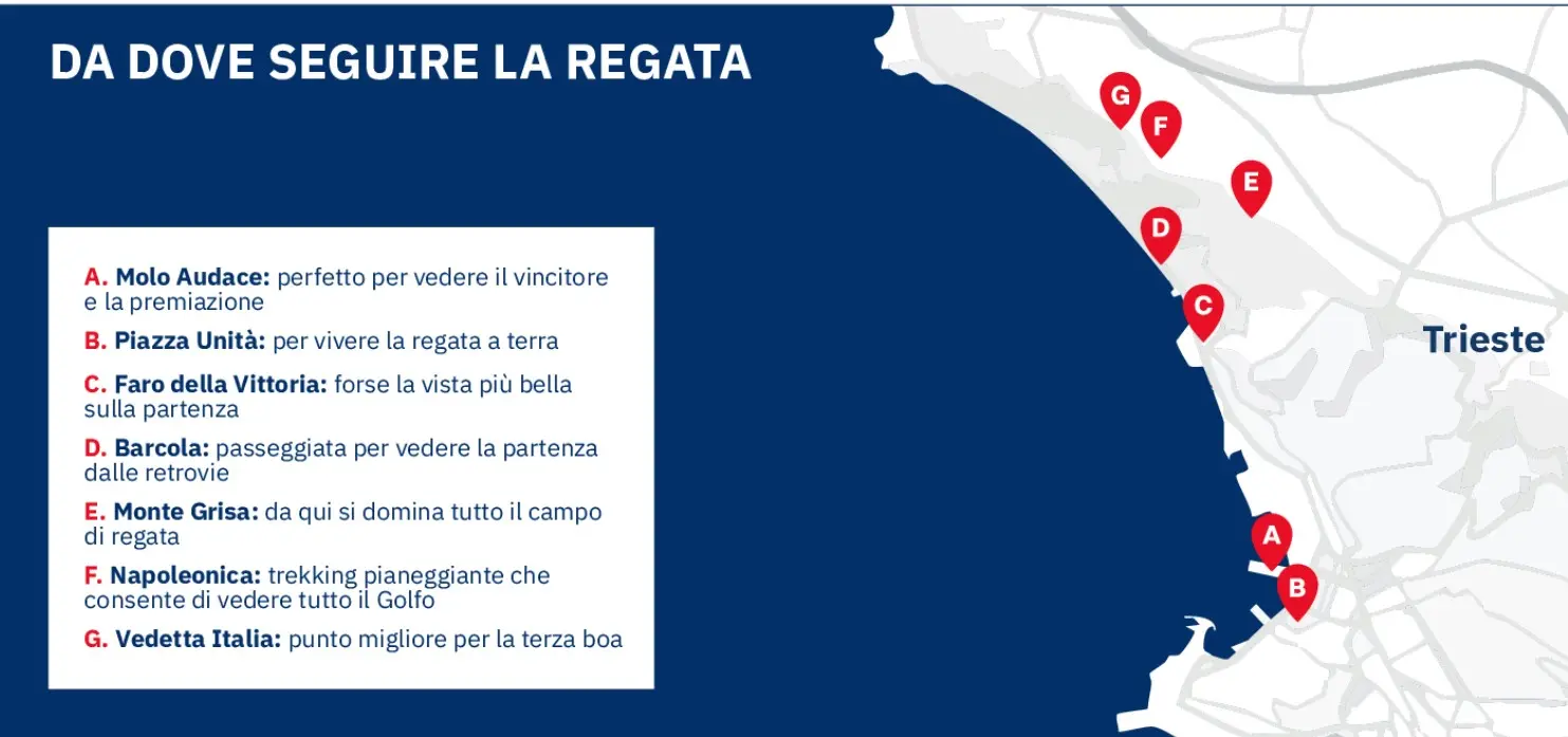 La parte alta di via Udine, strada del Friuli, il tratto del costone vicino a Prosecco, in particolare il tragitto che collega le vie san Nazario e Vicentina, il piazzale di Monte Grisa, la Napoleonica. Sono questi gli storici punti che garantiscono la miglior visuale della Barcolana. Si tratta di aree che i triestini e gli appassionati della Regata d’Autunno provenienti da fuori città, che raggiungono frequentemente Trieste nell’occasione della Barcolana, conoscono molto bene e che certamente saranno prese d’assalto, come oramai accade da anni.