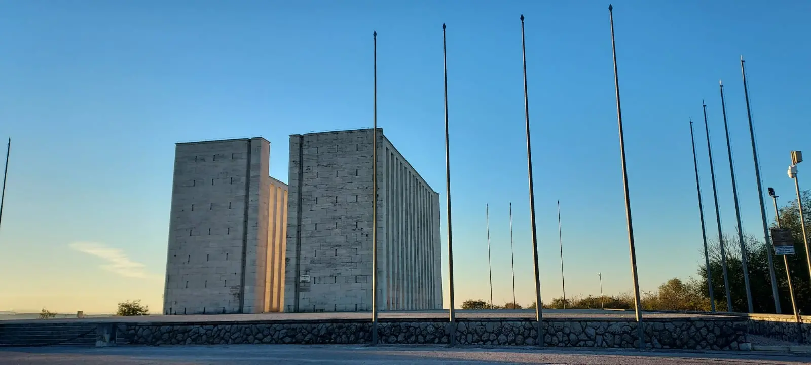 Tra Palmanova e Gorizia si erge questo tempio bianco, da un’altura invita a riflettere. Silenzi e simboli nel progetto dell’architetto milanese Bacciocchi Zolle di terra e acque di mare per onorare i morti delle guerre