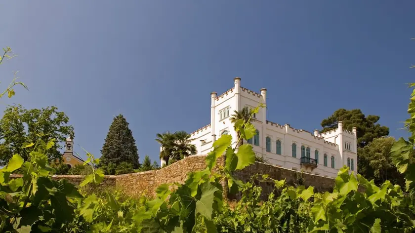 Un viale di castagni e cedri conduce alla villa in pietra bianca d'Aurisina in stile neogotico- Tudor rievocante il Castello di Miramare, con portico e due torri ai lati della facciata principale che guarda il pendio.